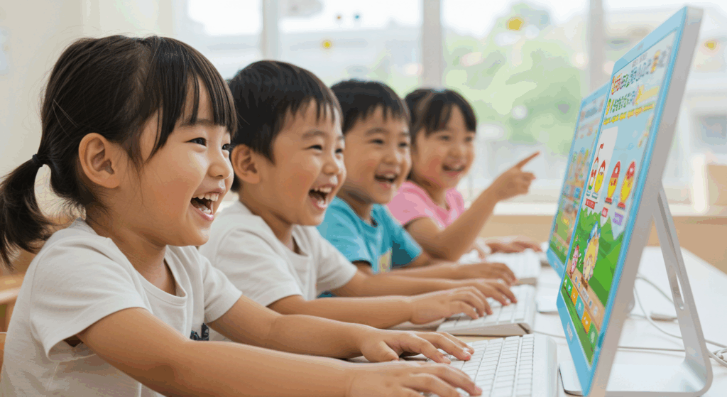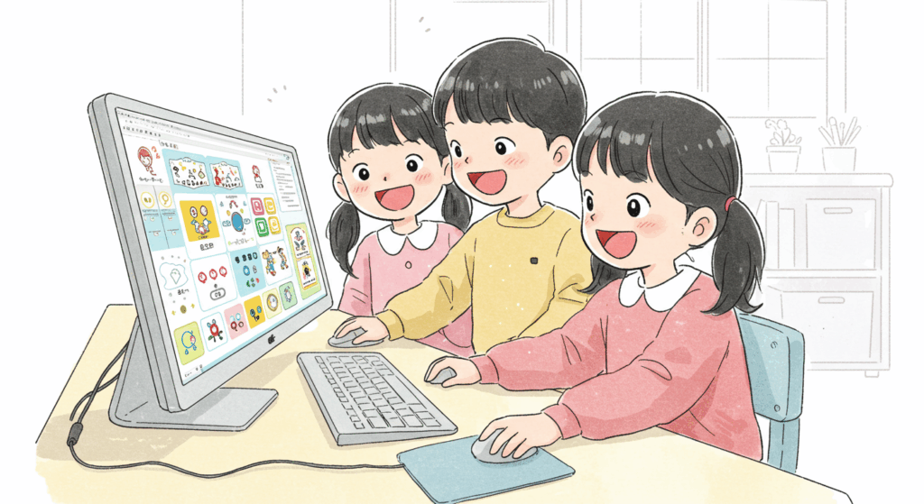 - タイピングスキルの向上: マウスやキーボードの基本操作を学ぶため、タイピングトレーニングを行うことができ、子どもたちのコンピュータ操作能力を高めます。